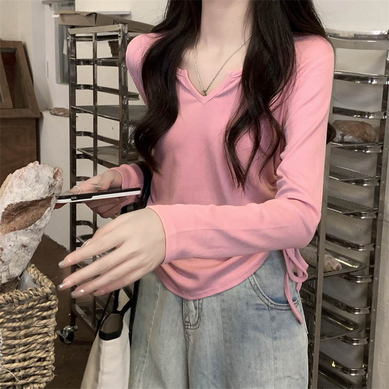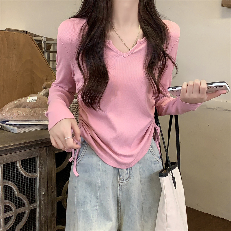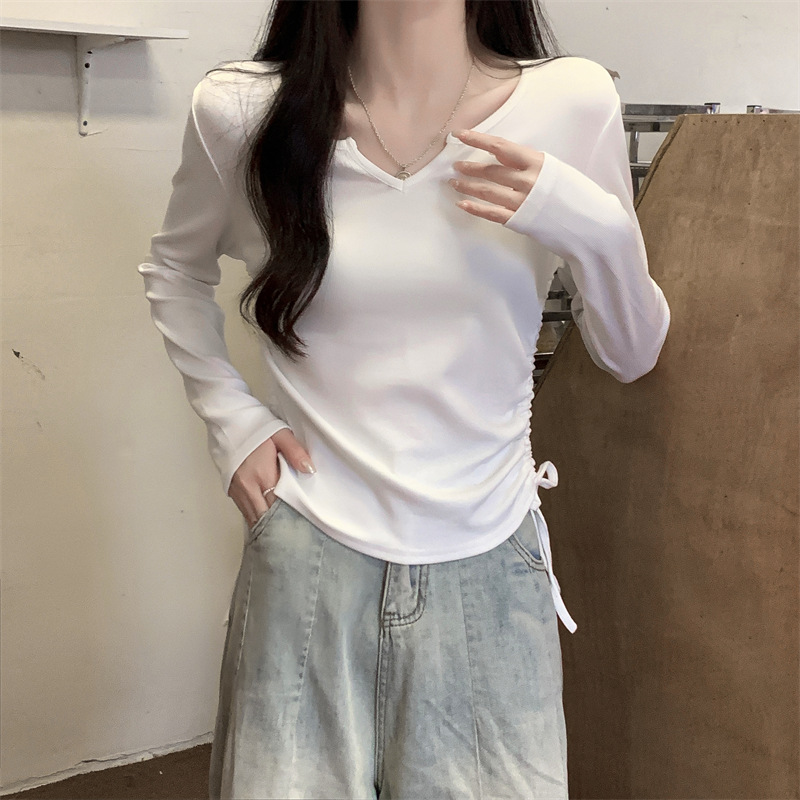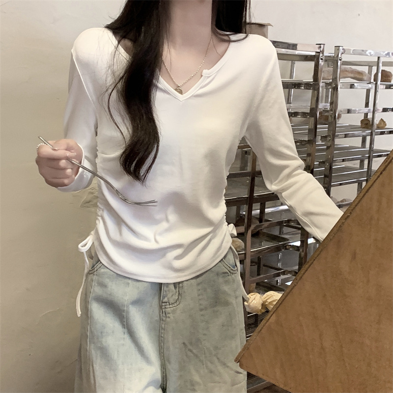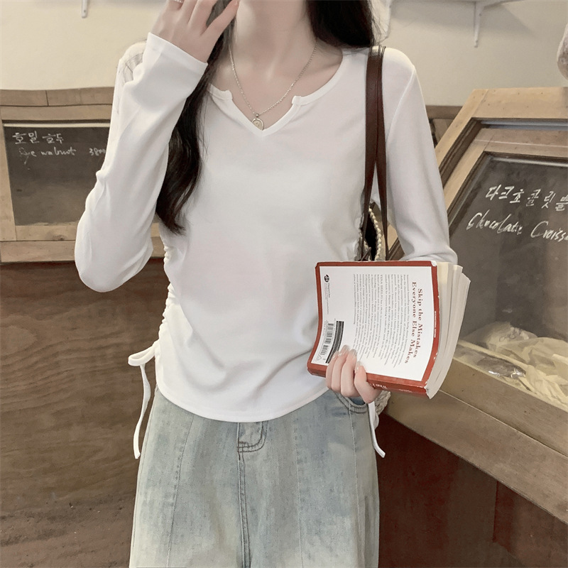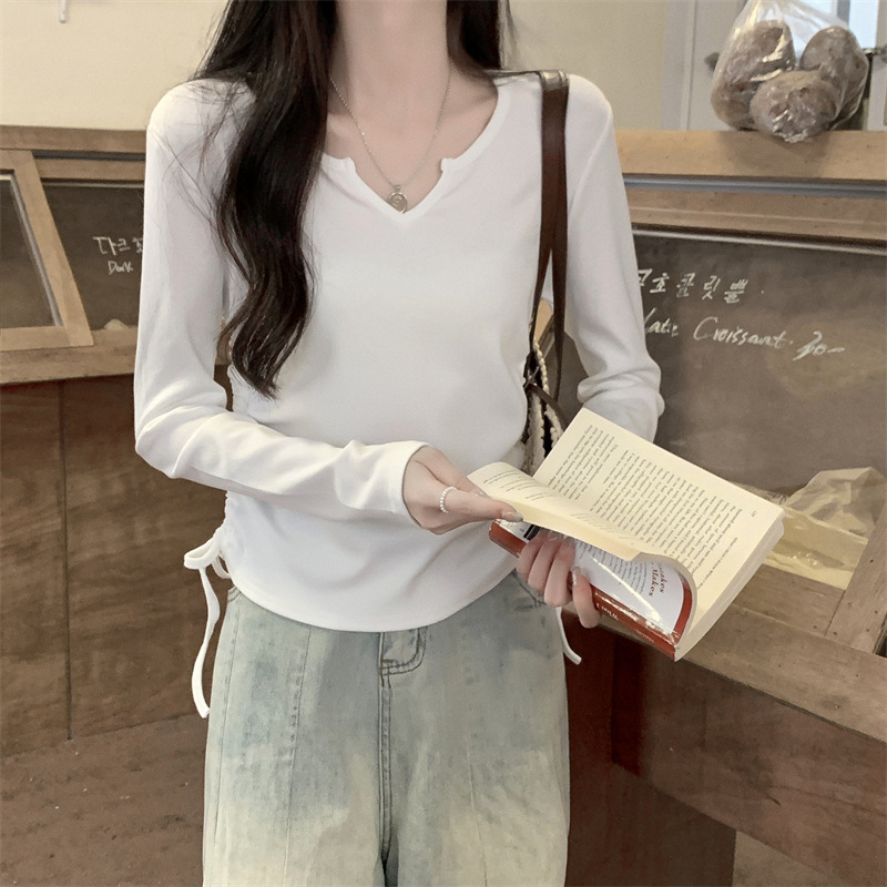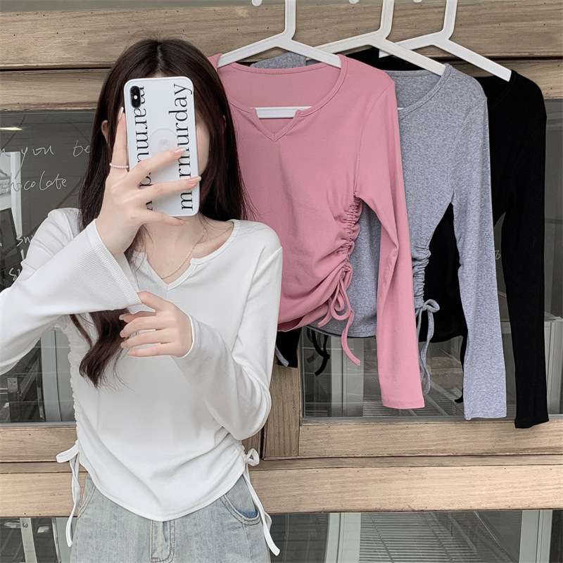 V领抽绳小众显瘦长袖T恤女秋季修身设计感别致短款上衣内搭打底衫