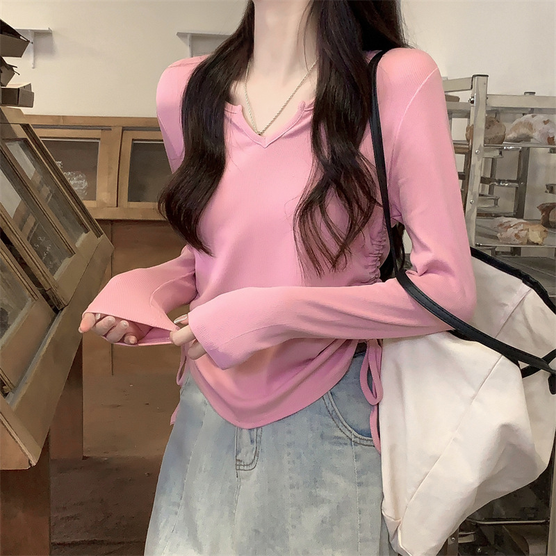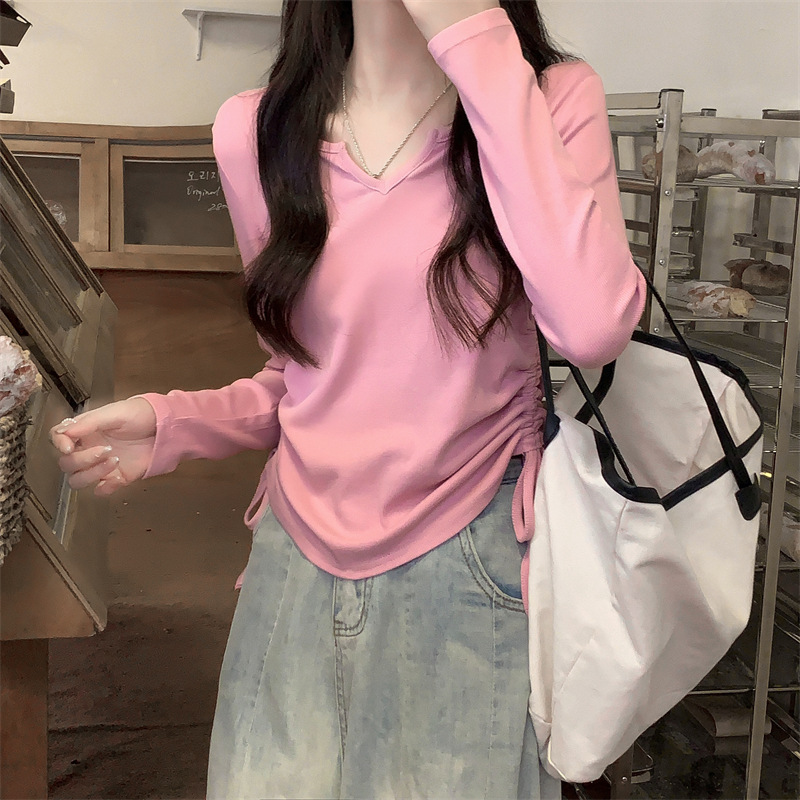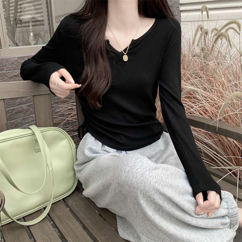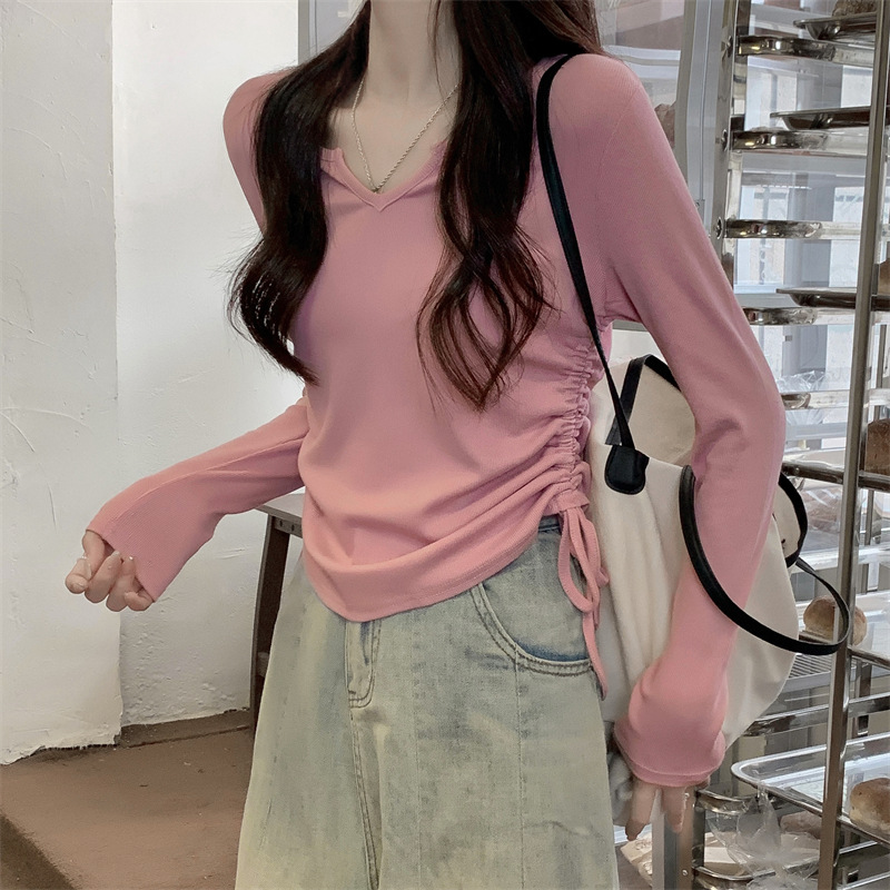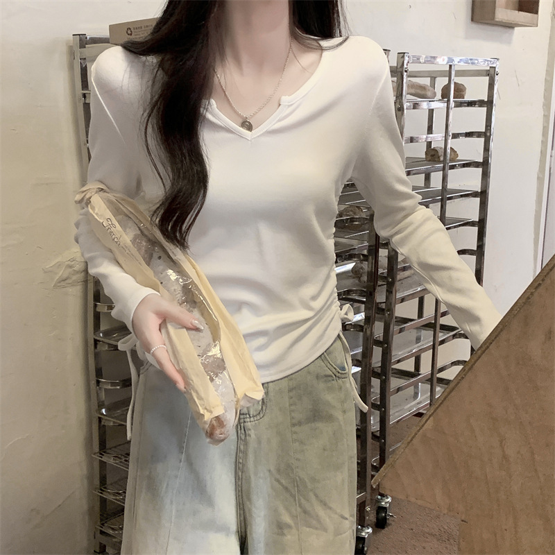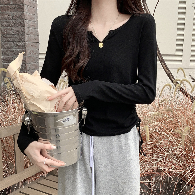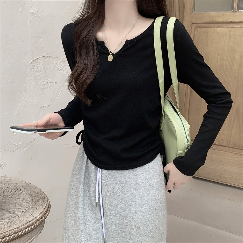 V领抽绳小众显瘦长袖T恤女秋季修身设计感别致短款上衣内搭打底衫