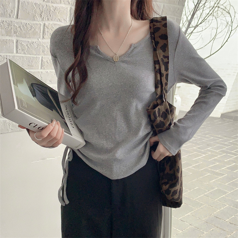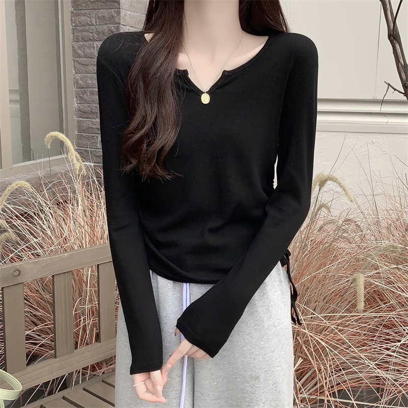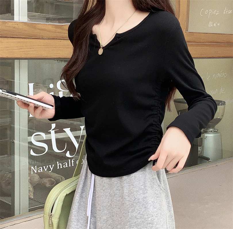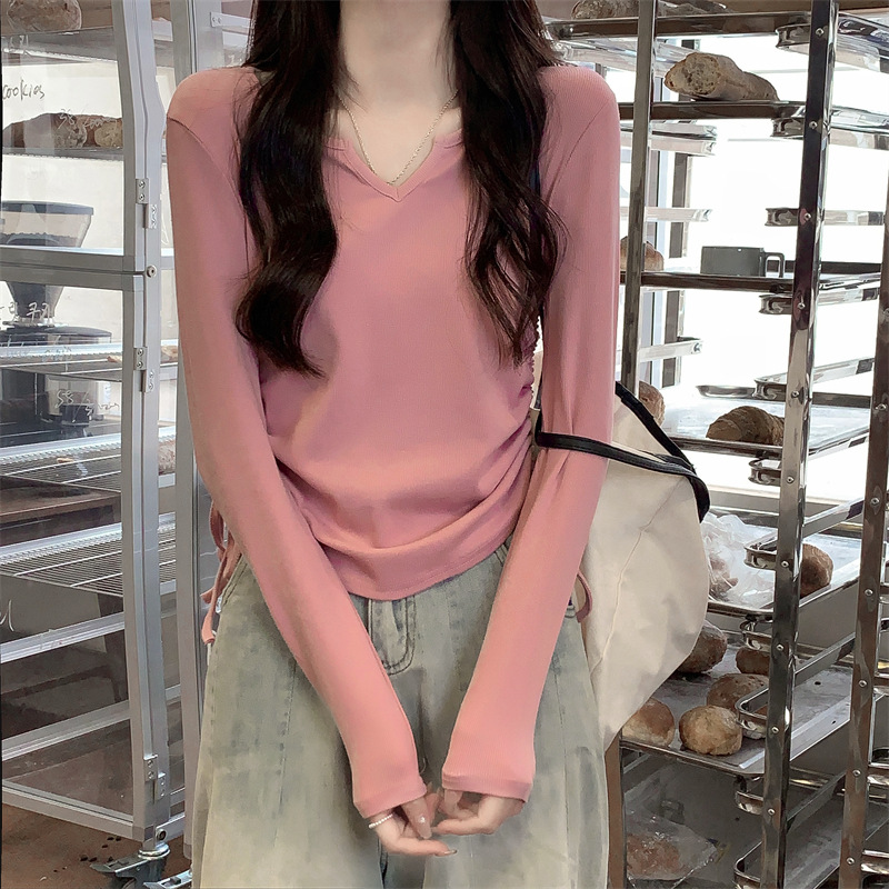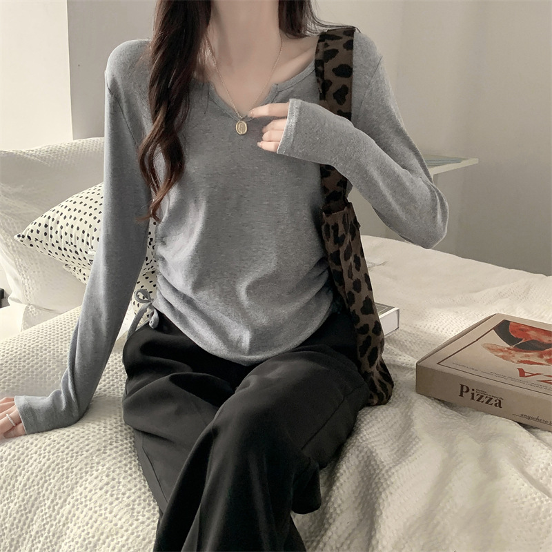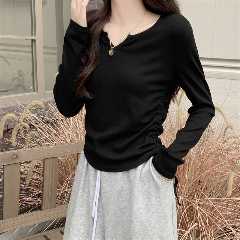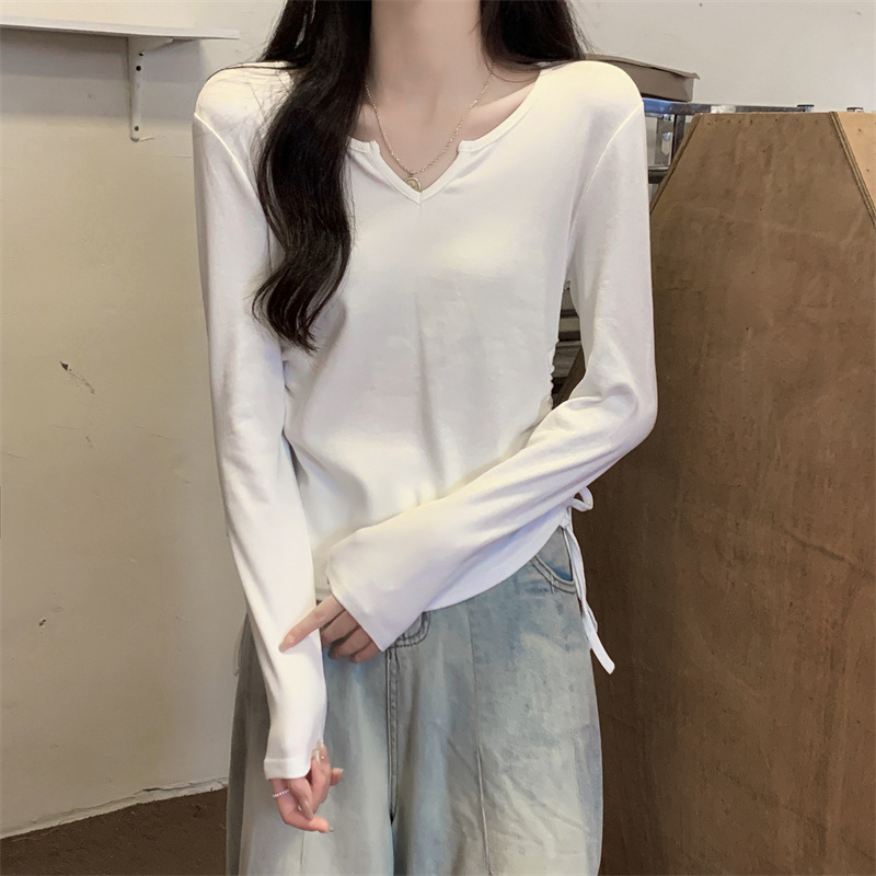V领抽绳小众显瘦长袖T恤女秋季修身设计感别致短款上衣内搭打底衫