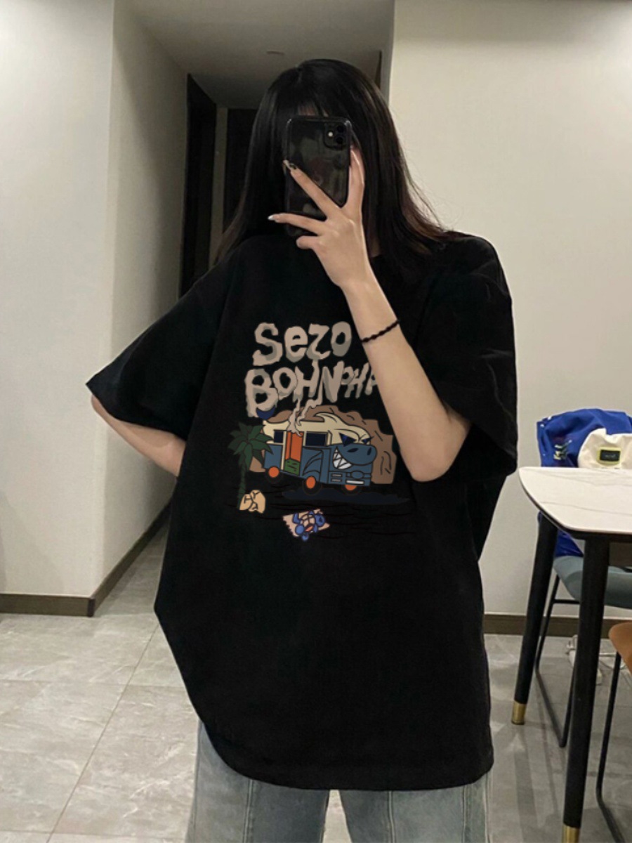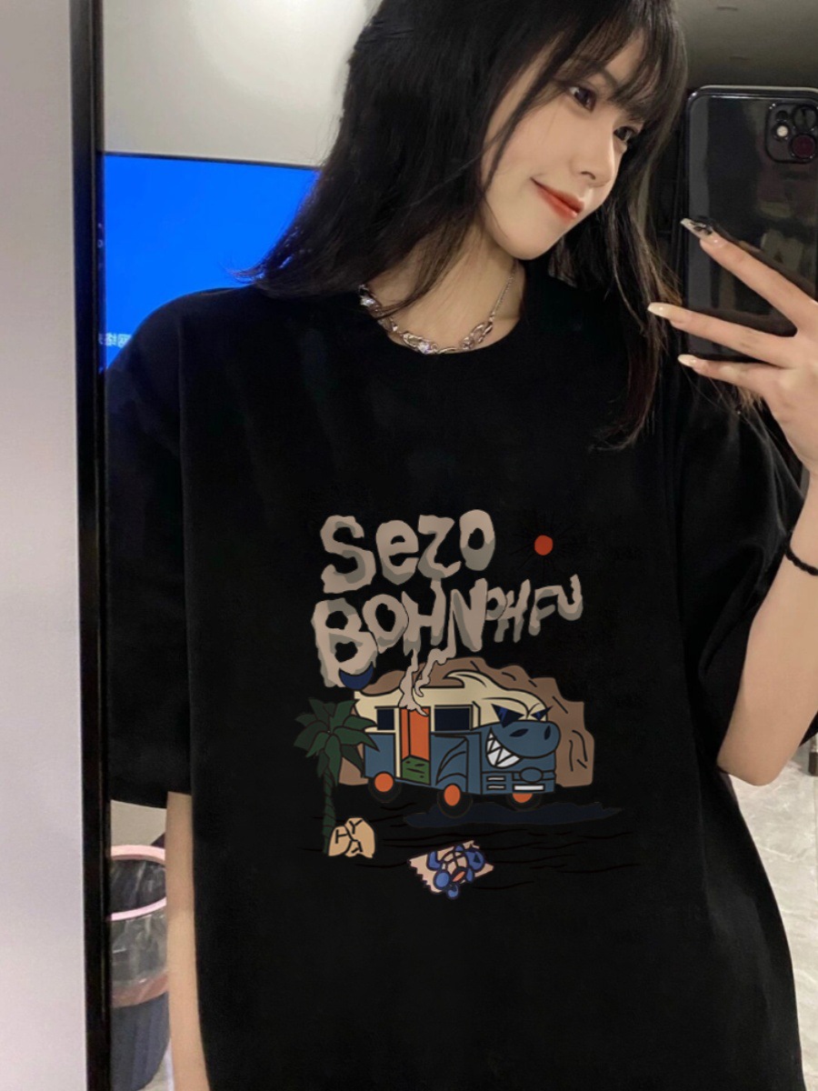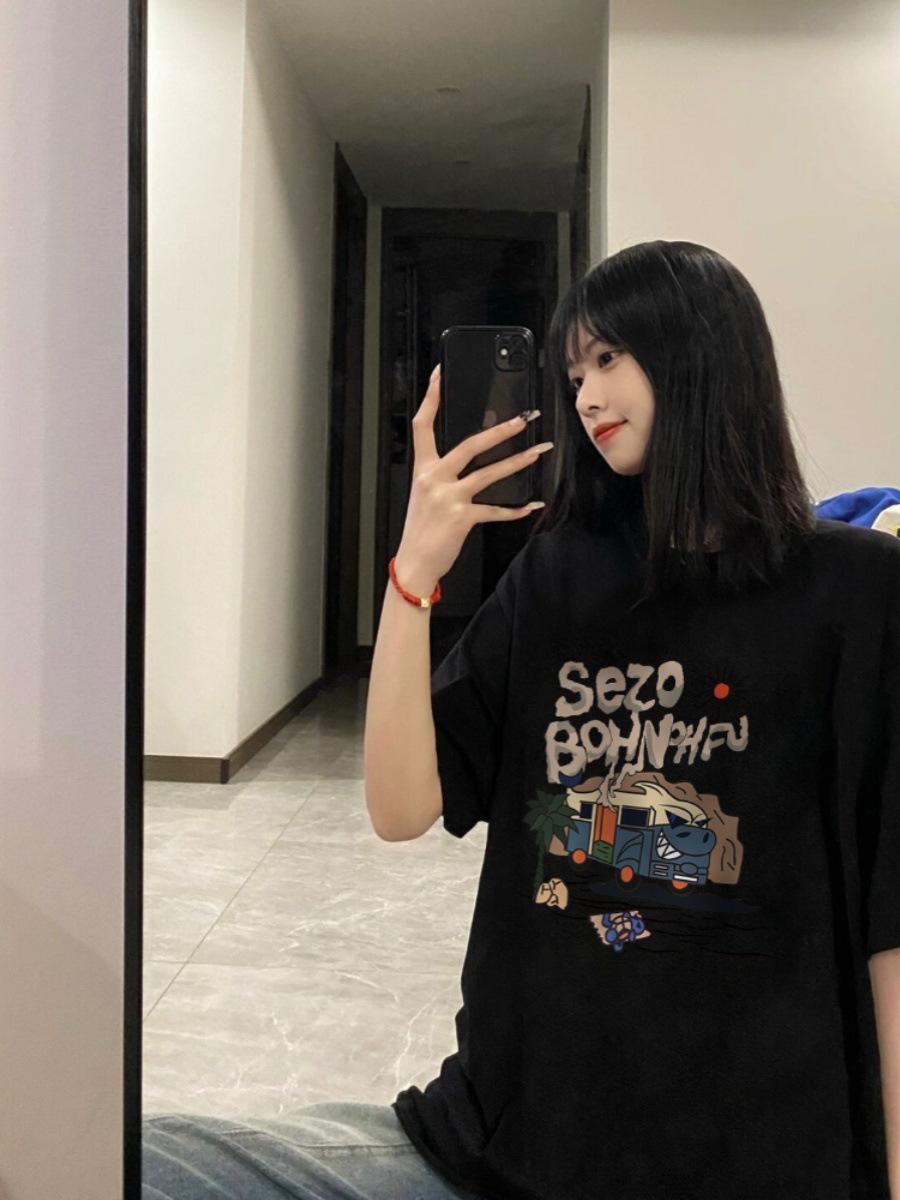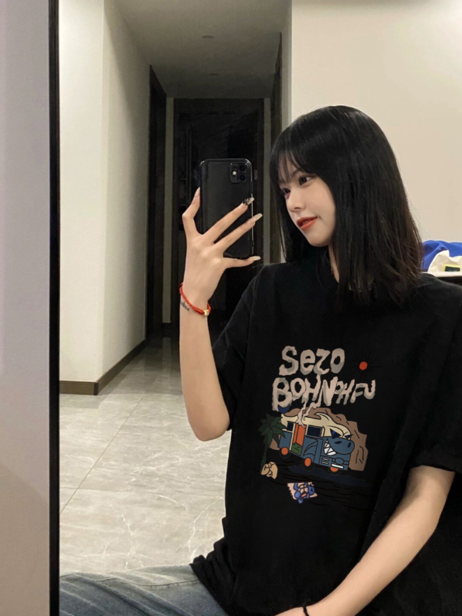 黑色纯棉休闲半袖宽松oversize夏季短袖T恤女装2024新款大版上衣